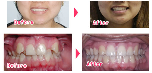 上あごを広げる装置と前に出すための装置により治療。きれいな横顔、かみ合わせ、歯並びになりました。